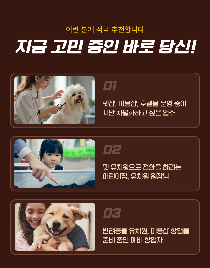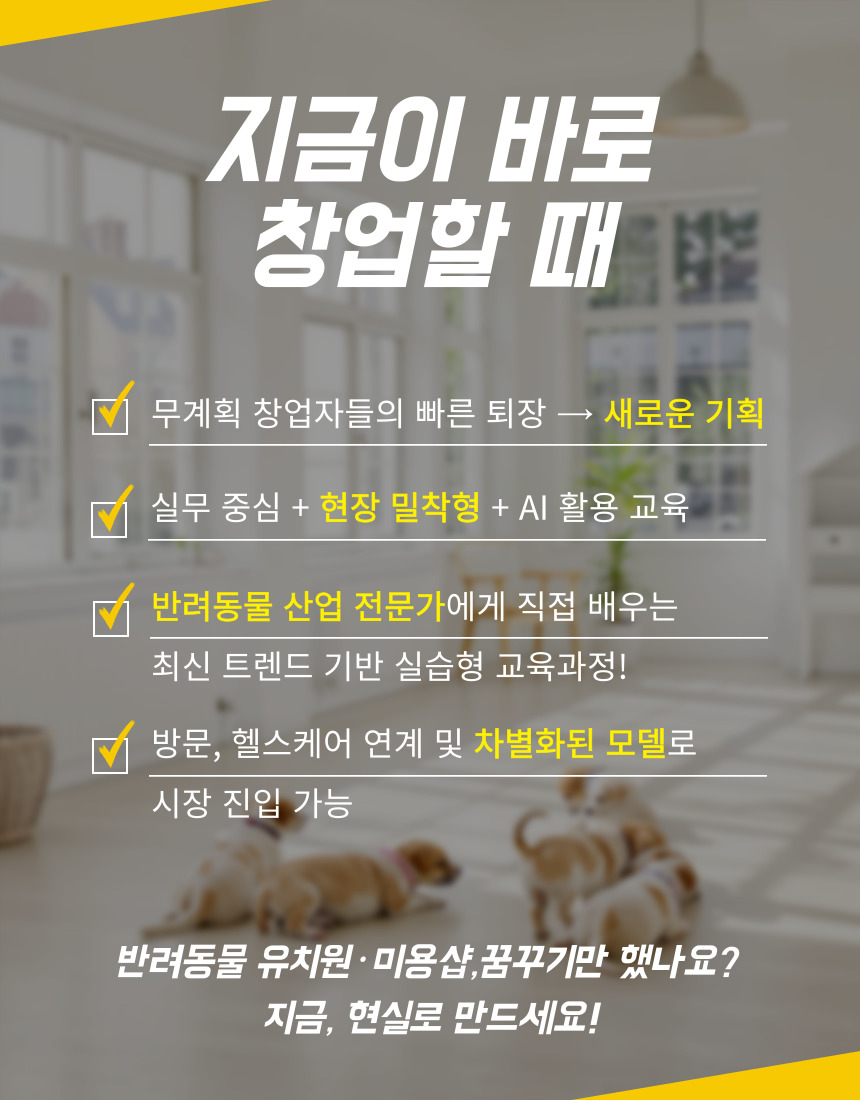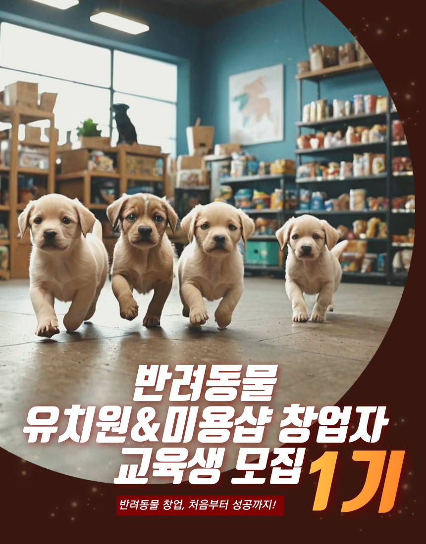 건국대학교 미래지식교육원 전문교육 <반려동물 유치원&미용샵 창업전문가 1기>의 수강생을 모집하고 있습니다.