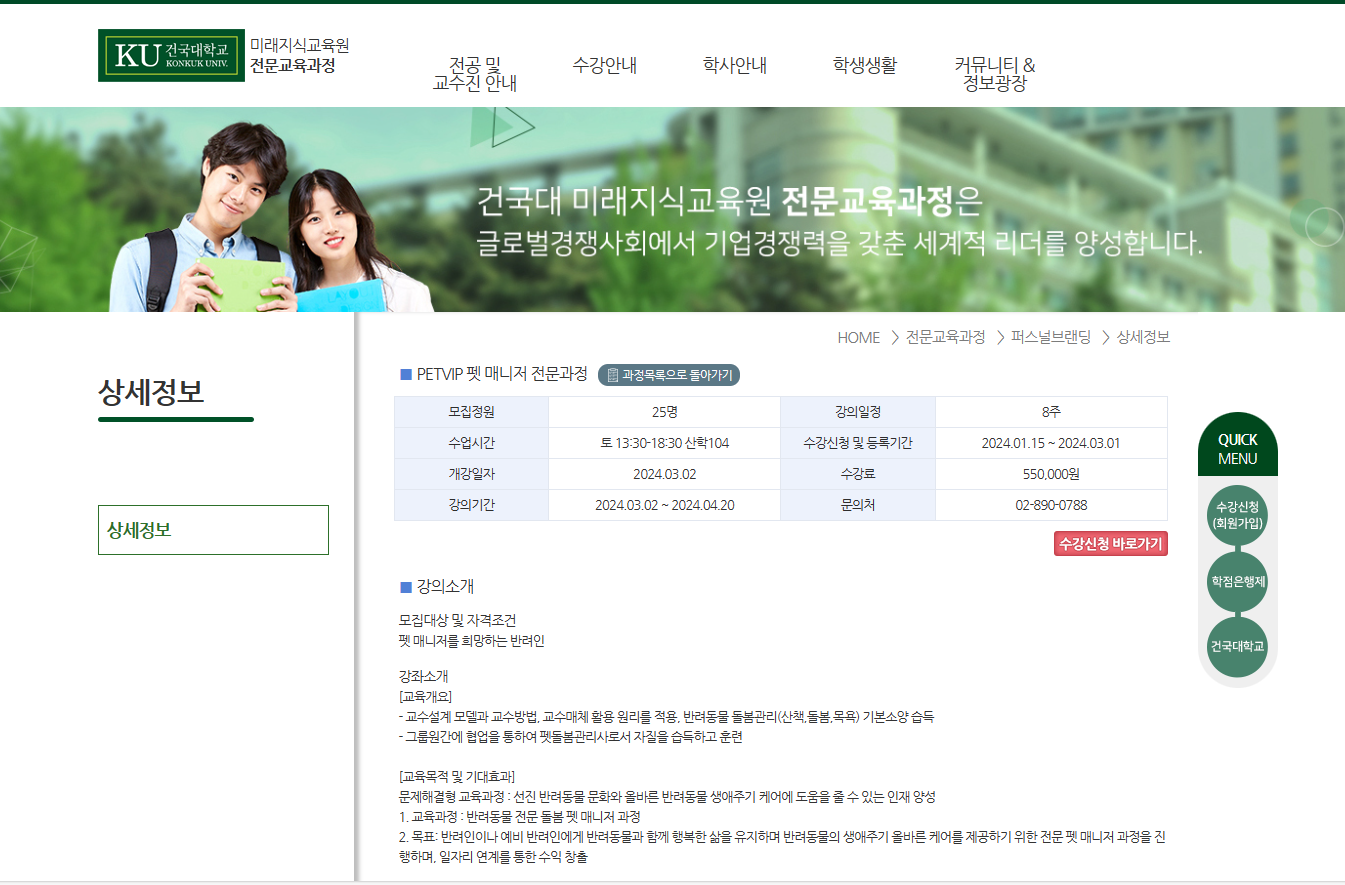 ▶ 접 수 처 : 건국대학교 미래지식 교육원 PETVIP 펫 매니저 전문과정 강의 신청 바로가기 회원가입 후, 수강신청 및 등록